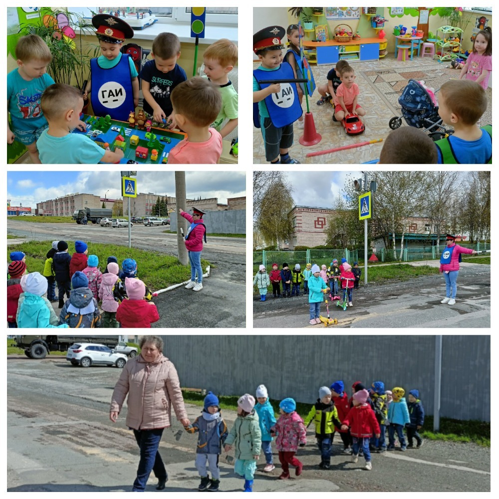 Возле пешеходного перехода малышей встретил инспектор дорожного движения. В игровой форме все вместе закрепили знания о пешеходном переходе, светофоре, правилах езды на самокатах. В группе играли в дидактические игры «Собери знак», «Наш друг-светофор», сюжетно — ролевую игру «Водители», подвижные игры «Красный, желтый, зеленый», «Воробышки и автомобиль».